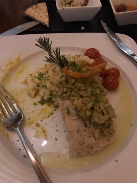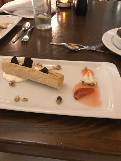 The sun was a little less shy today! It made several appearances during the afternoon and we finally got to put our sunglasses and beach hats to good use. We dined at Opa, the hotel’s Greek-sounding Mediterranean restaurant, where we started with warm pita bread and a selection of tasty dips, including roasted red pepper hummus. My dad and I had Greek salads and the fresh catch of the day (tender sea bass on a bed of risotto) and my mum had tagine, a flavourful Moroccan stew made with meat (often fish, chicken, or lamb), potatoes, coconut milk, and spices. Needless to say, the tagine was delicious! We shared three small desserts: French créme brûlée, a platter of Spanish manchego cheese, and a Sicilian cannolo (also known as cannoli).