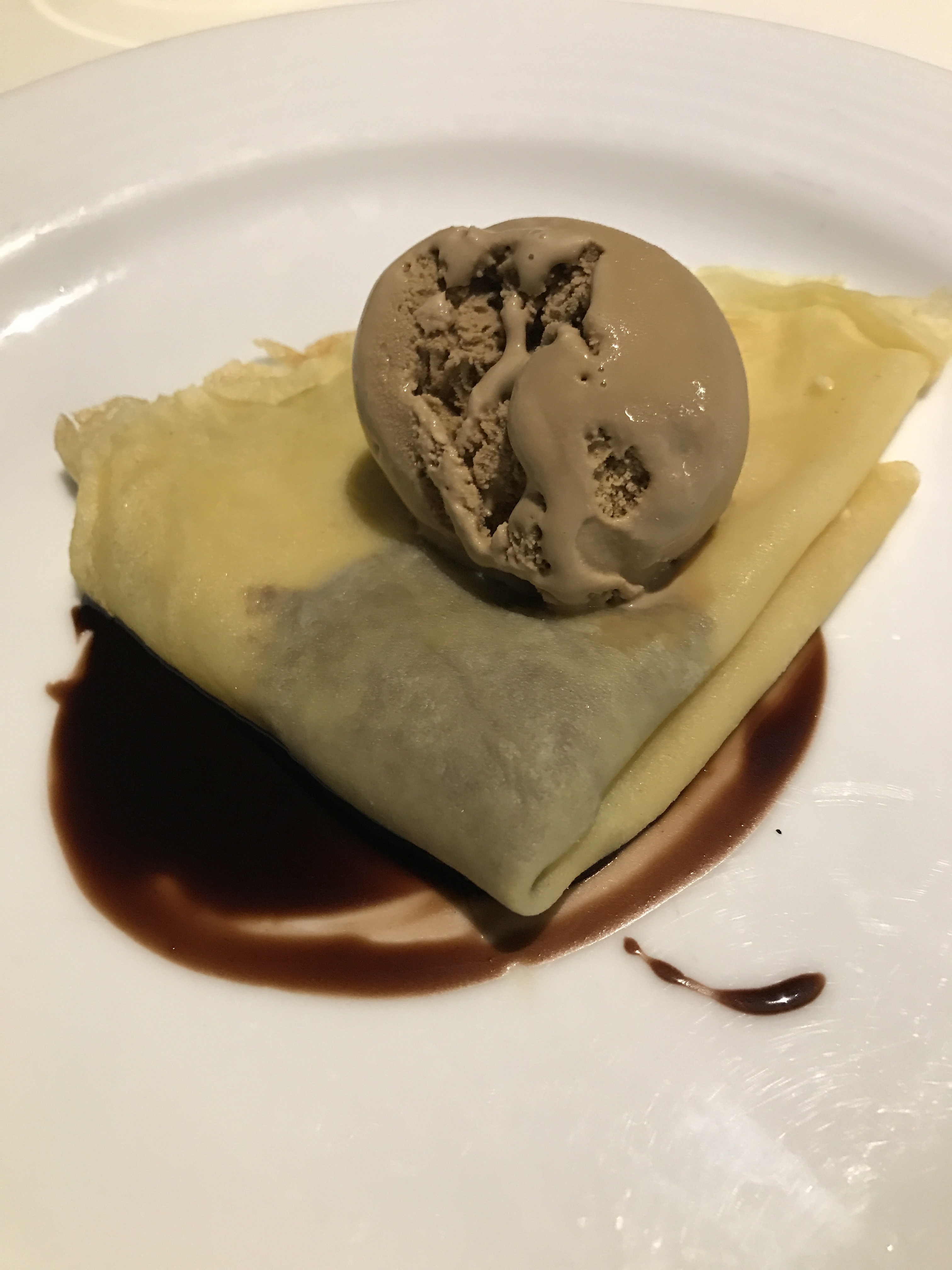 Crepe with chocolate ice cream and some Nutella (chocolatey, hazelnut spread)