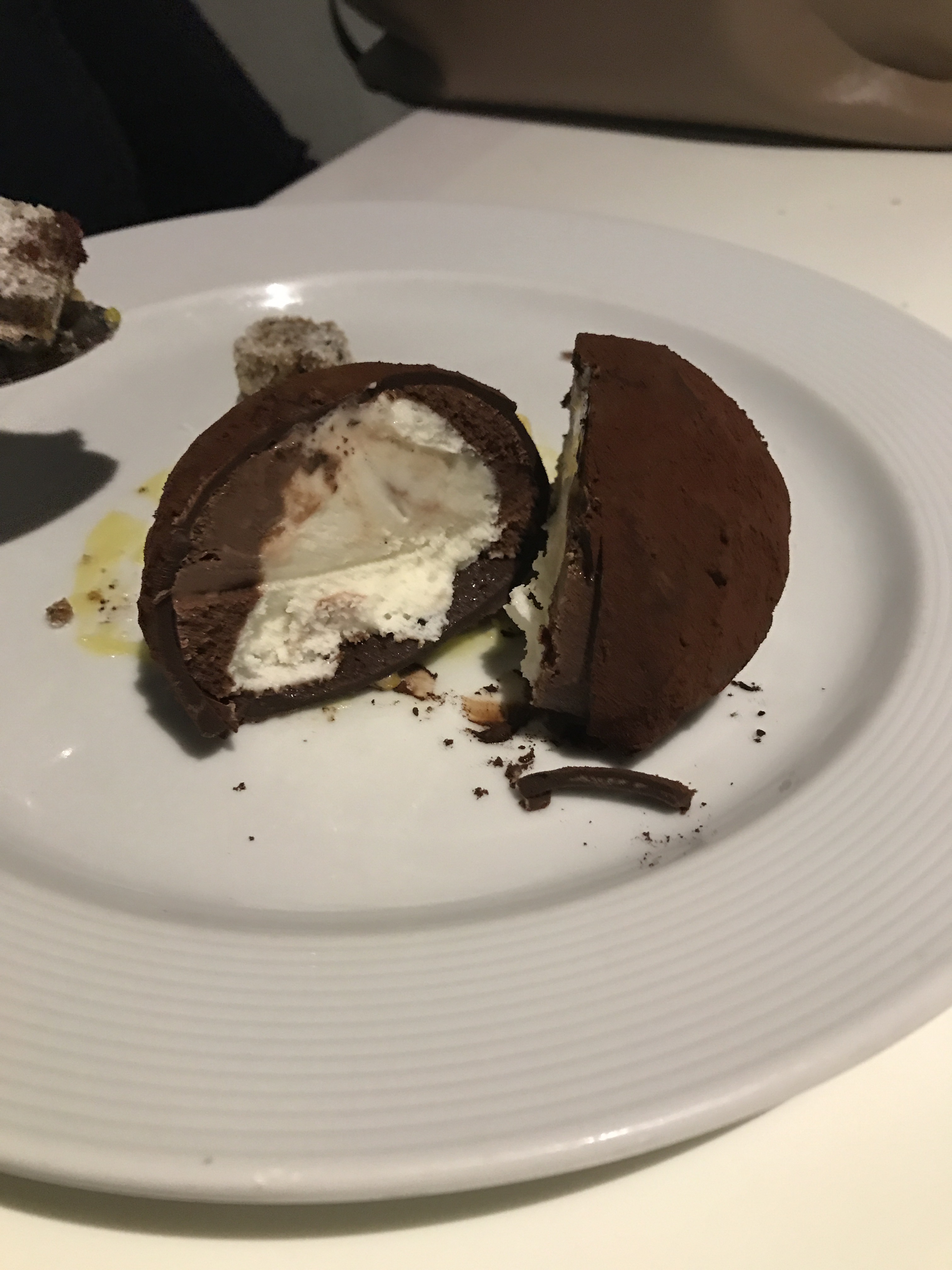 Tartufo (vanilla ice cream surrounded by a dome of hardened chocolate and dusted with cocoa)