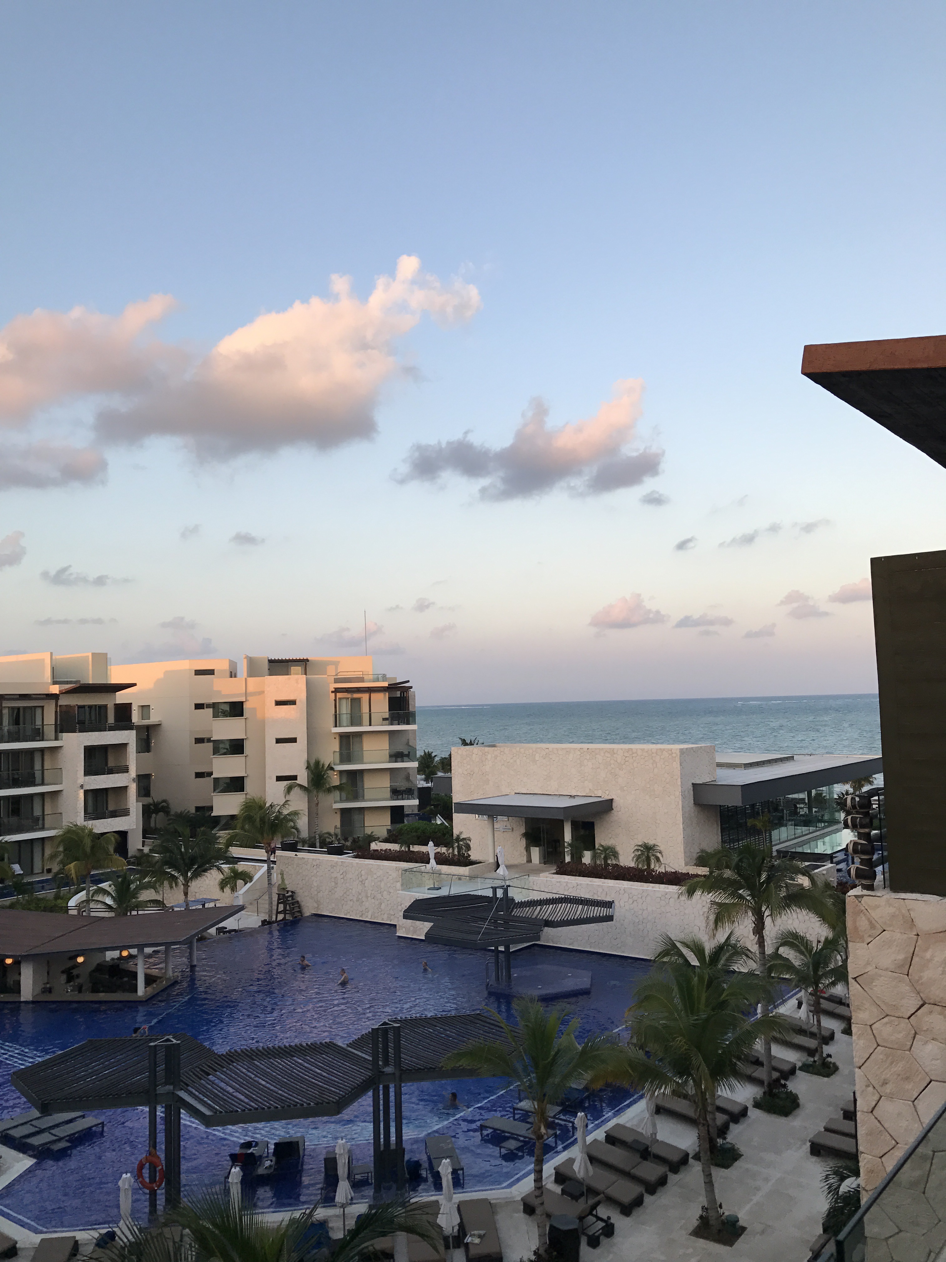 We arrived in Cancún at 10:25AM and got to the Hideaway at Royalton Riviera Cancún by lunchtime. The Royalton is a large and elegant hotel complex situated right on the beach, and the Hideaway is a smaller, adults-only section of the hotel where we stayed once before in 2015. The Royalton’s buffet food is fantastic (we couldn’t get enough fresh seafood and vegetables) and it boasts a great variety of restaurants. Everything is included, so you can eat to your heart’s delight. As soon as we checked in, we had a quick brunch at Dorado, the small restaurant within the Hideaway complex, and then headed to the beach for the afternoon. The beach and ocean were gorgeous, even with clouds and a ton of seaweed (results of a storm from the previous day). Luckily, the beach wasn’t too busy and we had no trouble finding umbrellas to lounge beneath. Before dinner, I went to the gym to work out in front of the sunset, which became my daily habit (while my mum swam laps in the pool). We ate at the Royalton’s Japanese restaurant, Zen – the food wasn’t as delicious as we remembered from 2015, and there was a frustrating hour-long wait for a table. Still, the food tasted fresh and the presentation was really inventive! (See the matcha cheesecake below.) The Royalton entertainment that evening was a terrifying yet impressive fire show where performers juggled flaming batons while leaping and dancing around the stage.