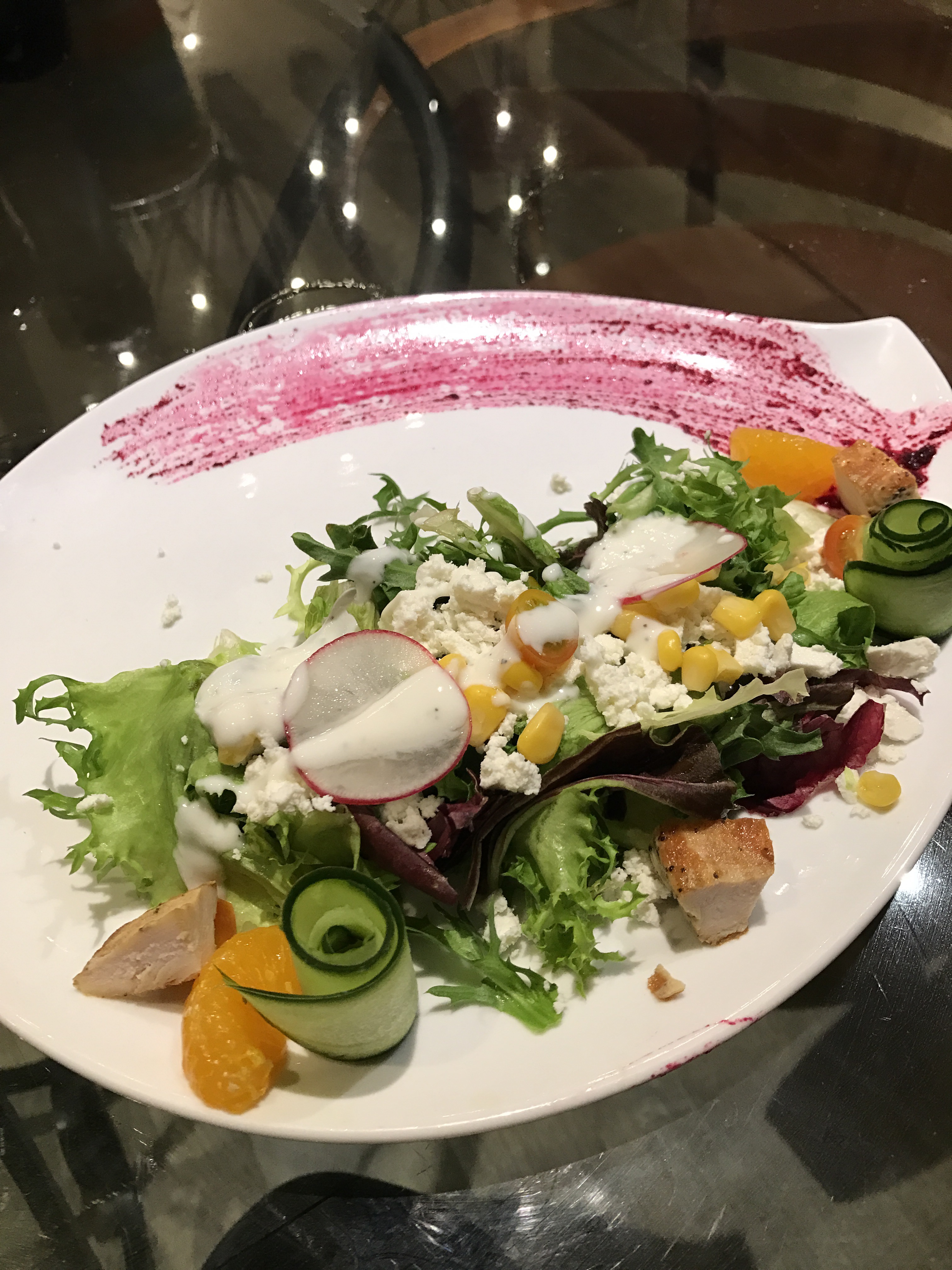 Chicken salad – three cubes of chicken, hard cheese, and tasteless vegetables. Another pass!