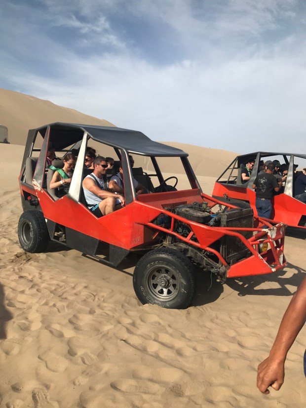 Next up was Huacachina, a stunning desert town 1.5 hours southeast of Paracas. Our central meeting point was at a surprisingly gorgeous hostel, where we were offered free wi-fi and the option to dine at a poolside restaurant. Many of us decided to preorder food for later so that we could eat it on the way home. I chilled out in the shade and bought an extra bottle of water because it had suddenly gotten hot and sunny (approximately 28 degrees Celsius). The Peru Hop website was definitely right to suggest bringing sunscreen and sunglasses!