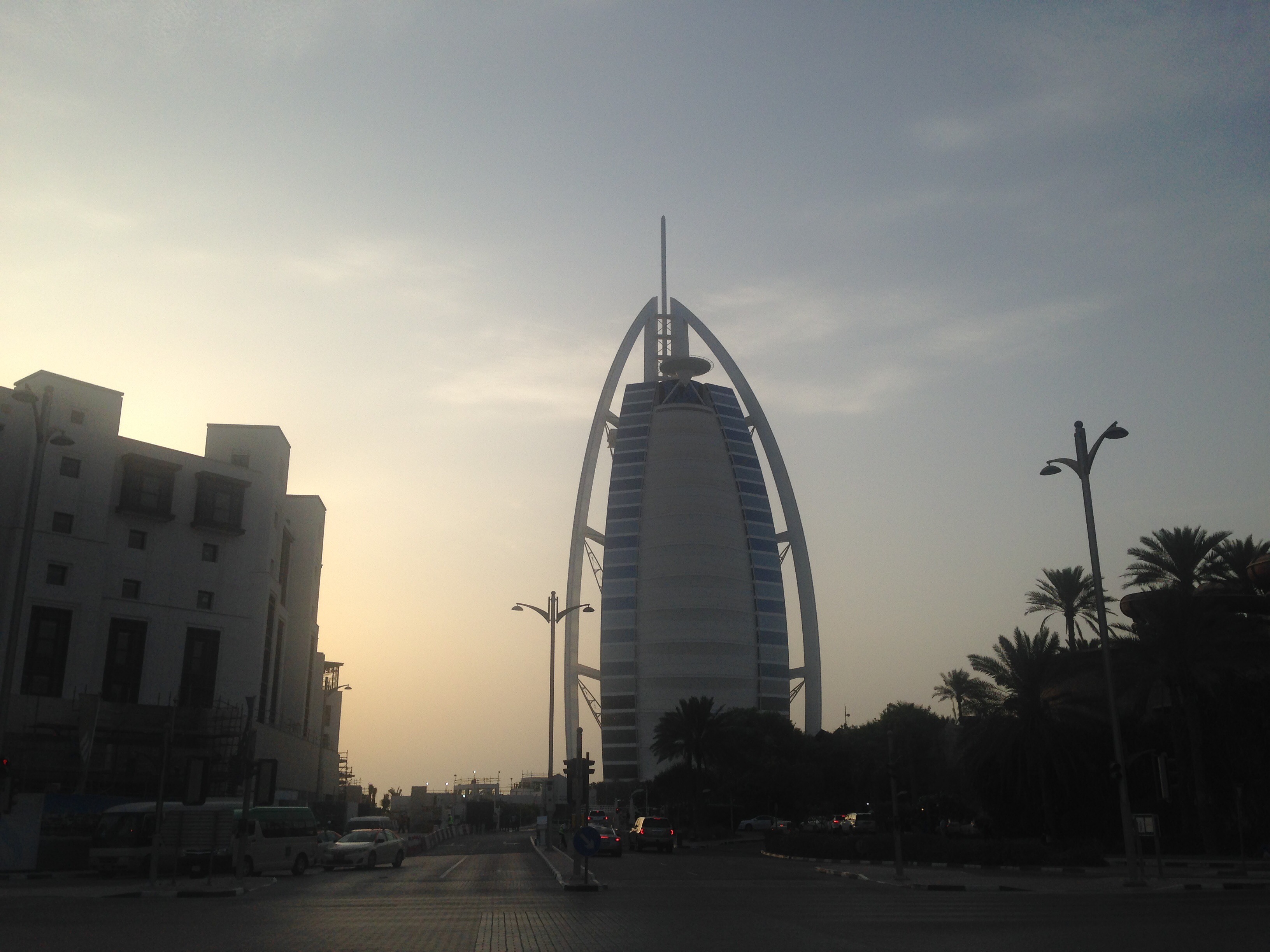 Finally, we saw Jumeirah Beach and its main attraction: the dhow-shaped Burj Al Arab, which I believe is the only 7-star hotel in the world. We arrived there in the early evening and strolled along the boardwalk as the sun was setting: